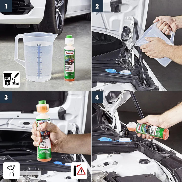 Upgrade your windshield washer fluid with SONAX Clear View Concentrate 1:100 – a powerful, streak-free formula designed for superior visibility and fast bug, dirt, and grease removal.