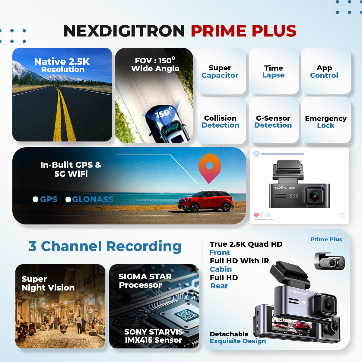 Prime Plus Dashcam offers triple-channel recording, capturing the front view, interior cabin, and rear view simultaneously with Front Camera: Shoots in stunning 2.5K QHD for sharp, clear footage. Interior Cabin Camera: Records in 1080p Full HD, perfect for rideshare or taxi drivers. Rear Camera: Covers tail-end traffic in 1080p Full HD, ensuring full-proof rear protection.