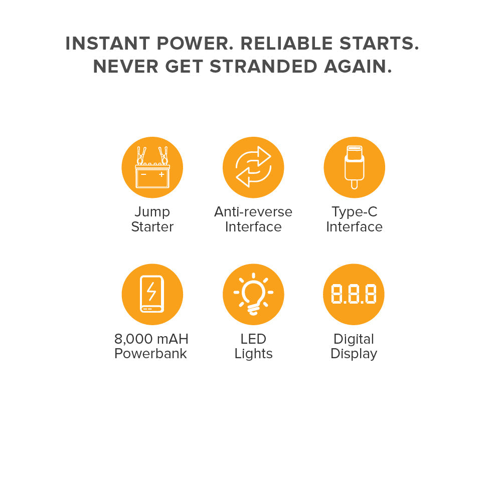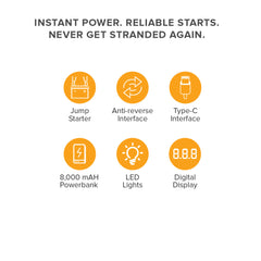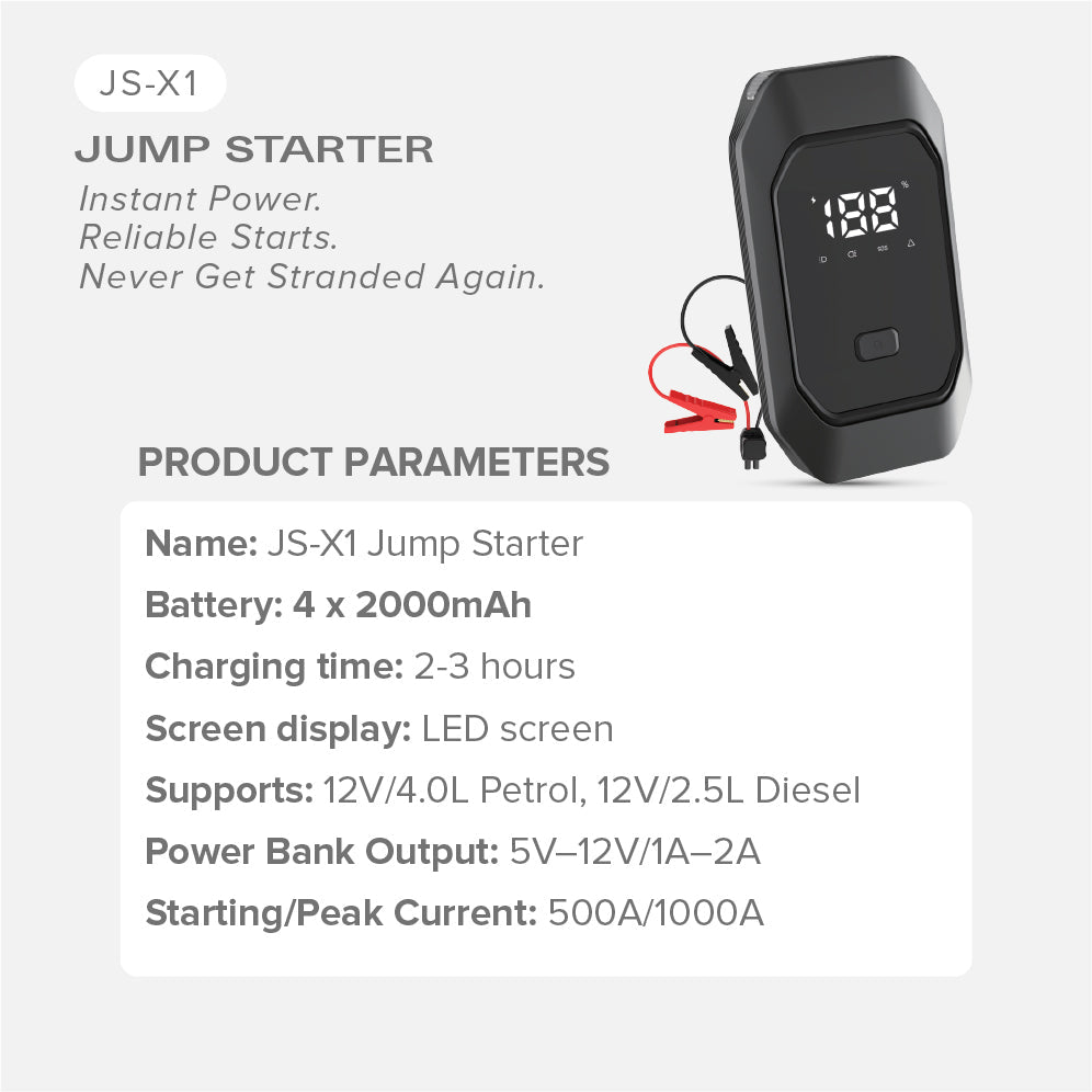 Meet the Stellar Drive JS-X1 Jump Starter — your compact, high-power emergency companion. Designed for reliability and portability, the JS-X1 ensures that you never get stranded with a dead battery again.
