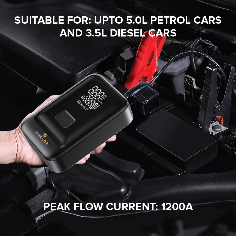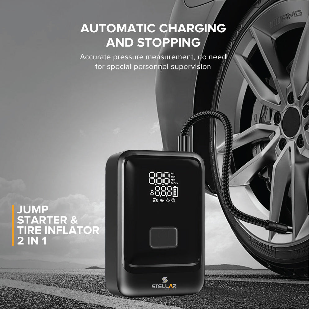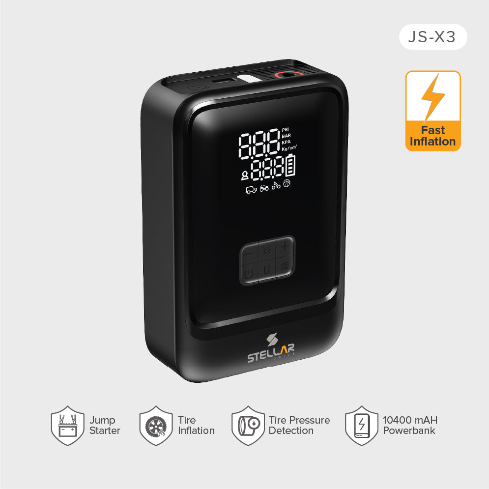 Meet the STELLAR DRIVE JS-X3 — the ultimate 4-in-1 road safety device. Engineered for emergencies, long drives, and everyday reliability, the JS-X3 combines a 160 PSI inflator, a 1500A jump starter, a 10400mAh power bank, and a bright SOS LED into one compact powerhouse.